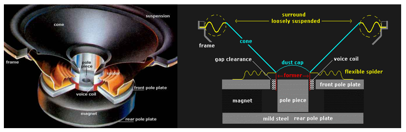 揚(yáng)聲器的磁場主要由兩部分組成,magnet永磁體產(chǎn)生的磁場和通過音圈導(dǎo)線通電會(huì)在導(dǎo)線周圍產(chǎn)生磁場。改變通過導(dǎo)線的電流的極性也會(huì)改變導(dǎo)線周圍產(chǎn)生的磁場的極性。兩個(gè)磁場的相互作用導(dǎo)致音圈向前或向后被推出間隙,這取決于通過音圈的電流的極性,同時(shí)移動(dòng)的音圈連接到音圈骨架(former)和錐形面(cone),后者也會(huì)振動(dòng),從而產(chǎn)生噪音。