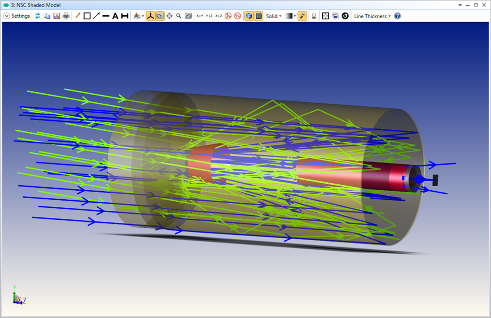 望遠(yuǎn)鏡模型中的月亮用離軸的橢圓光源表示。月亮近似為一個(gè)準(zhǔn)直光源,因此來(lái)自月亮(上圖綠色部分)的光線彼此平行。類似地,感興趣的觀察對(duì)象用軸上的準(zhǔn)直橢圓源表示。與典型的卡塞格林式望遠(yuǎn)鏡設(shè)計(jì)一樣,準(zhǔn)直光線(上圖中的藍(lán)色光線)從軸上視場(chǎng)聚焦到像平面上形成一個(gè)良好的點(diǎn)。然而,一些光線(來(lái)自月球和恒星)沒(méi)有經(jīng)過(guò)期望的光學(xué)表面順序,但仍能到達(dá)探測(cè)器。