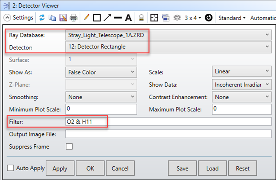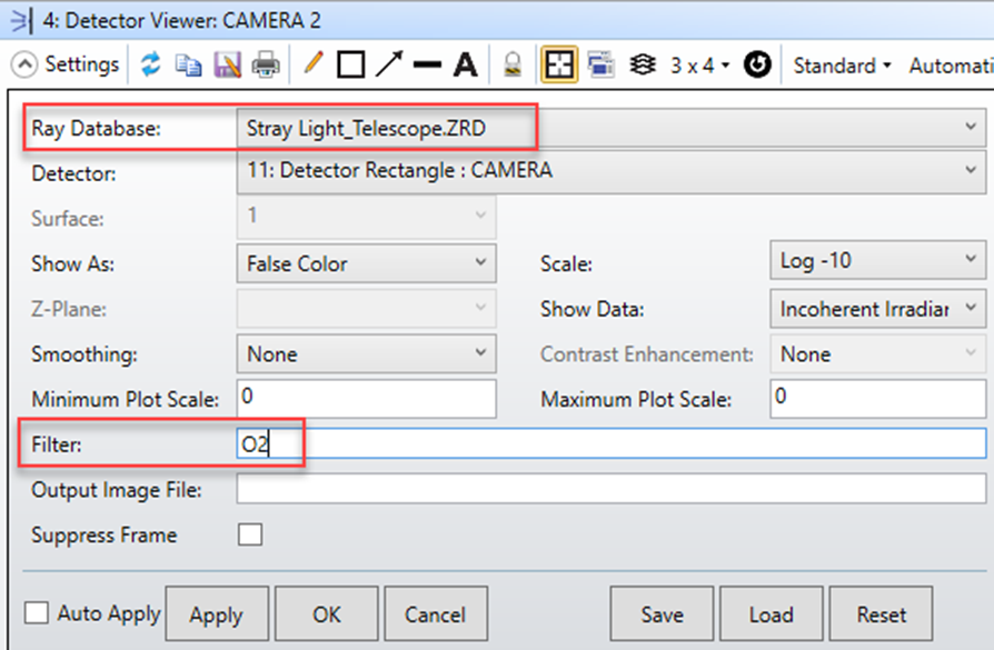 過(guò)濾字符串可以應(yīng)用于3D布局圖,探測(cè)器查看器,和(正如我們已經(jīng)看到的)在光線數(shù)據(jù)庫(kù)查看器。在每個(gè)分析工具的設(shè)置中,可以將所需的過(guò)濾字符串輸入到字符串條目中。我們可以使用當(dāng)前的示例文件進(jìn)一步演示其中的一些功能。