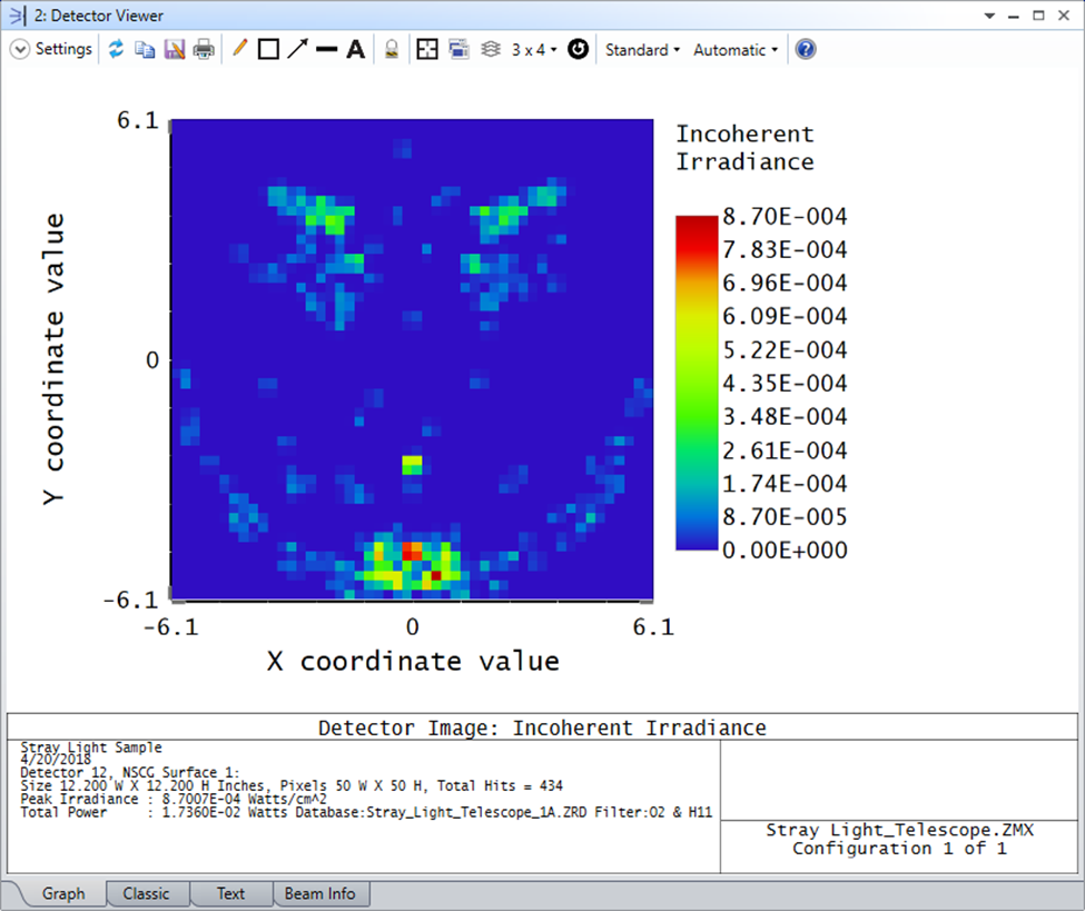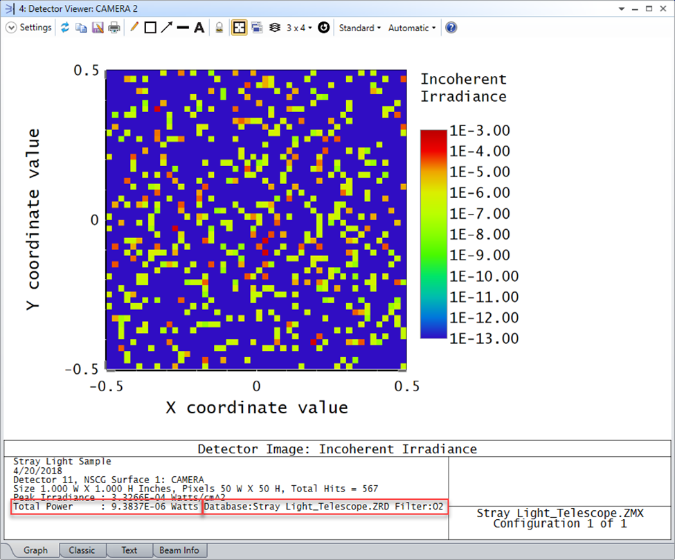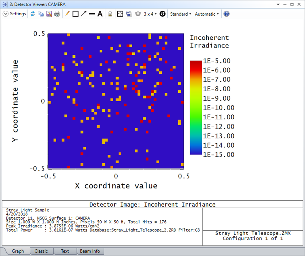 根據(jù)保存的光線數(shù)據(jù)庫(kù)的大小和字符串的復(fù)雜性,OpticStudio可能需要一些時(shí)間來(lái)處理數(shù)據(jù)。一旦完成,探測(cè)器查看器應(yīng)該顯示過(guò)濾的光線數(shù)據(jù)。