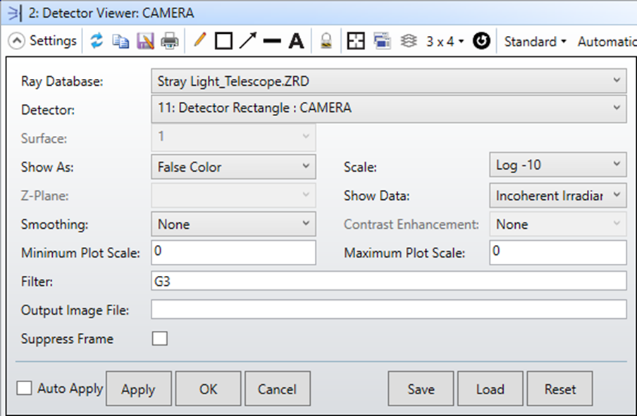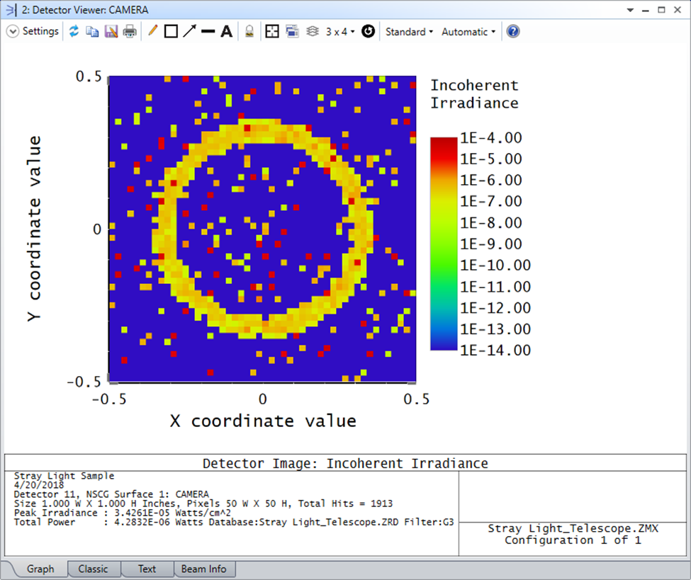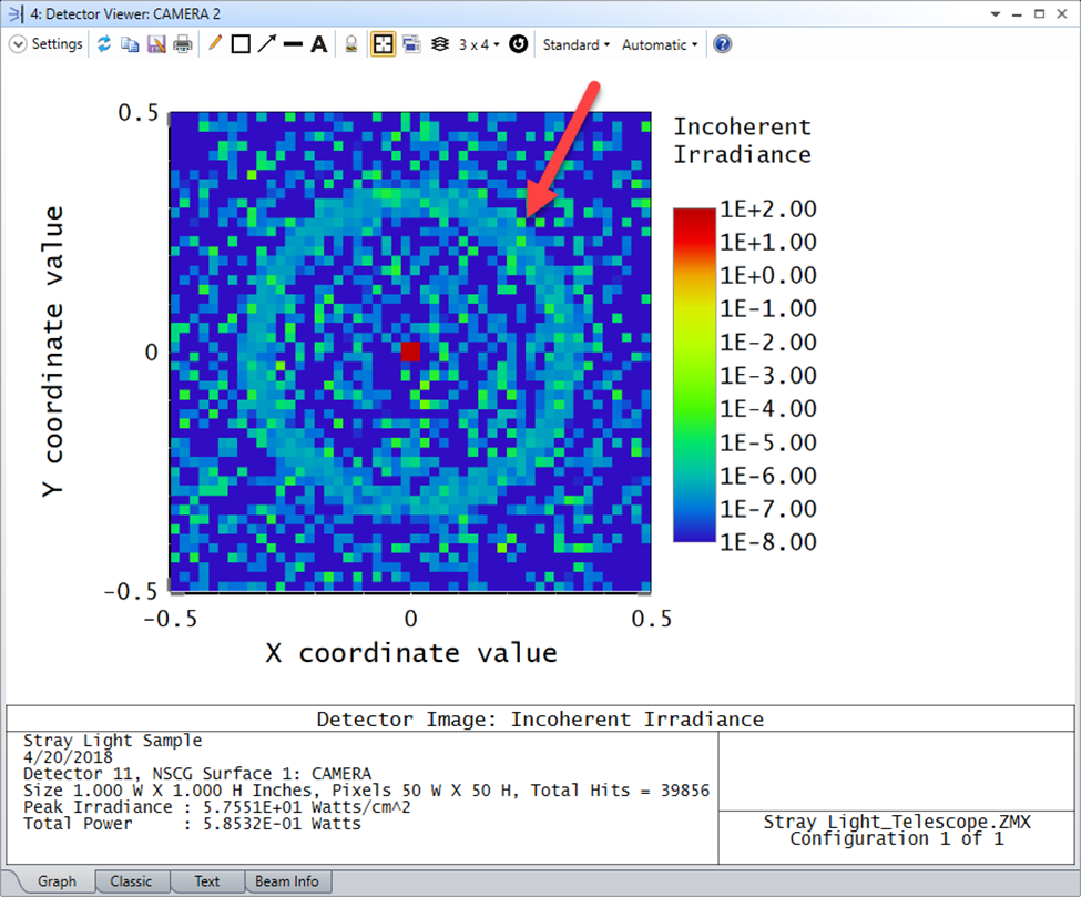 一旦光線追跡完成,確保在探測(cè)器查看器中選擇合適的ZRD文件,并應(yīng)用相同的鬼影過(guò)濾器G3。通過(guò)涂覆校正透鏡,我們有效地消除了射線的偽“環(huán)”,并將總“鬼影”能量降低了一個(gè)數(shù)量級(jí)。