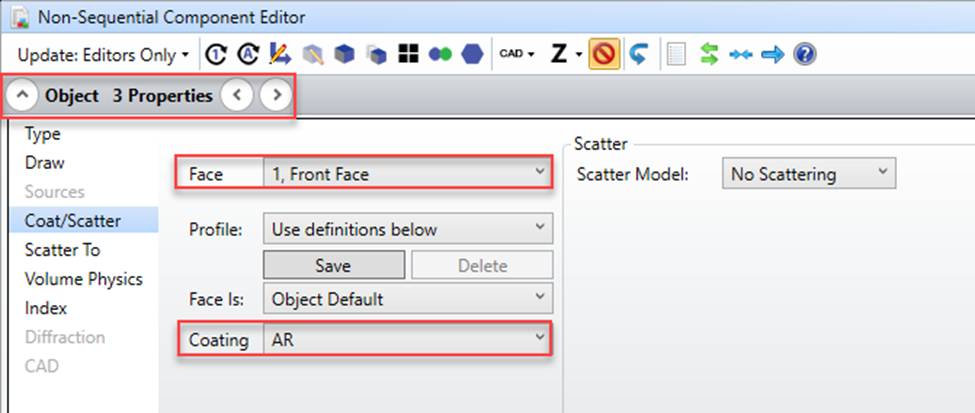 打開對(duì)象3的對(duì)象屬性對(duì)話框,在校正器的正面和背面都放置一個(gè)抗反射(AR)涂層。這是針對(duì)當(dāng)前初級(jí)波長(zhǎng)優(yōu)化的單層MgF2涂層。