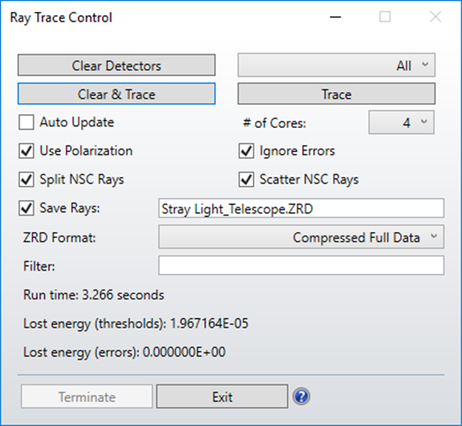 使用“使用偏振Use Polarization”、“忽略錯(cuò)誤Ignore Errors”、“分割光線Split Rays”、“散射光線Scatter Rays”和“保存光線Save Rays”進(jìn)行初始的非序列光線跟蹤。保存光線與任何想要的文件名。注意,光線必須在過(guò)濾字符串可以應(yīng)用到光線數(shù)據(jù)庫(kù)和探測(cè)器查看器前保存!目前,我們將把“字符串”條目留空,因?yàn)檫^(guò)濾器也可能在以后的設(shè)置中應(yīng)用到個(gè)別分析功能中。