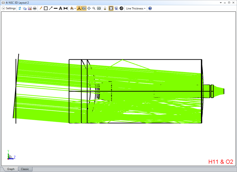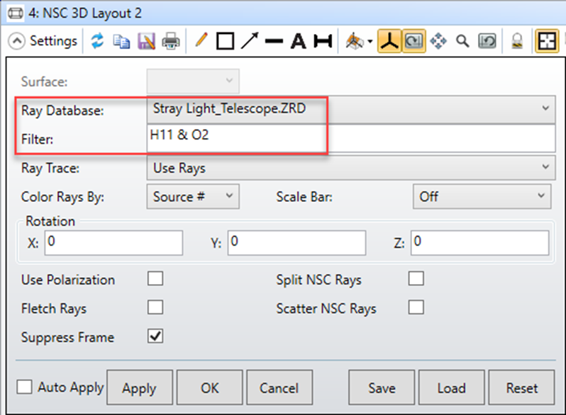 你可以想象,第11號(hào)探測(cè)器并不適合回答這個(gè)問(wèn)題。然而,正如前面提到的,過(guò)濾字符串也可以應(yīng)用于布局圖。在當(dāng)前的示例中,打開NSC 3D布局圖的設(shè)置,再次從光線數(shù)據(jù)庫(kù)下拉菜單中選擇先前保存的ZRD文件。在布局中顯示整個(gè)射線數(shù)據(jù)庫(kù)將變得過(guò)于擁擠,無(wú)法執(zhí)行任何實(shí)質(zhì)性的分析,所以我們將在一會(huì)應(yīng)用一個(gè)適當(dāng)?shù)倪^(guò)濾器。