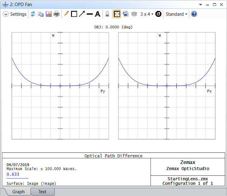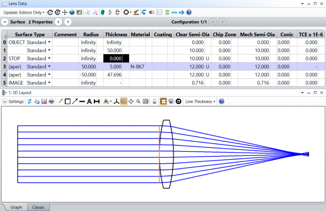 本文所考慮的系統(tǒng) (StartingLens.zmx) 由一個簡單的雙凸透鏡組成,工作波長為0.633 nm,像平面位于其近軸焦點處。