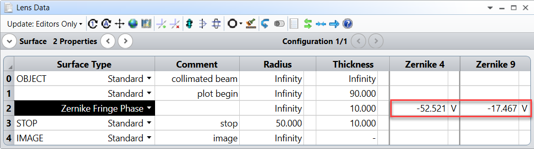 “ OFHSphericalCorrector_1.zmx ”是構(gòu)造文件 1,只包含一個準(zhǔn)直光束入射透鏡?!?OFHSphericalCorrector_2.zmx ”是構(gòu)造文件 2,它類似于構(gòu)造文件 1,但另外包含一個位于透鏡前表面前的相位板。該相位板使用 Zernike Fringe 相位表面 (Zernike Fringe Phase surface) 建模,該表面的所有項最初都被設(shè)為零。將分別表示離焦和三階球差的第 4 項和第 9 項設(shè)為變量,以便以后進行適當(dāng)?shù)膬?yōu)化。