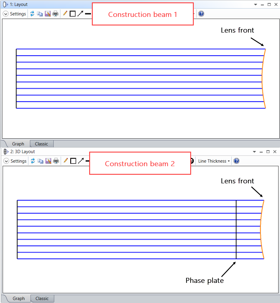 上圖是兩個構(gòu)造文件只繪制到鏡頭的前表面的布局圖,這也是每個文件中的系統(tǒng)光闌。光闌代表假定的兩個構(gòu)造光相互干涉的表面,只有在構(gòu)造文件中光闌位置處的光線交互位置的向量才能決定全息圖的屬性。從 OFH 的角度來看,構(gòu)造文件中所有在光闌后的表面都將被忽略,所以光闌后的表面在布局圖中為了清晰顯示都被隱藏了。