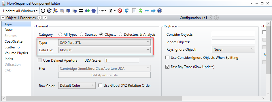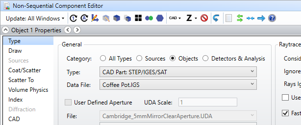 您可以在非序列元件編輯器的參數(shù)數(shù)據(jù)表格或物體的屬性窗口中修改和控制已導(dǎo)入CAD物體的屬性和參數(shù)。這些操作適用于上文提到的全部四種CAD文件格式。
