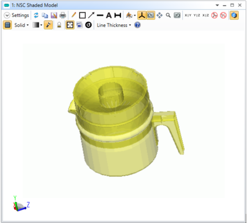 材料 (Material):每個(gè)物體僅能定義一種材料。比如,這個(gè)咖啡壺是由玻璃罐、塑料蓋、塑料手柄、將手柄與罐身連接的鋁環(huán),以及將手柄與鋁環(huán)固定的金屬螺絲組成。如果想導(dǎo)入這樣一個(gè)咖啡壺整體,則需要在CAD軟件分別導(dǎo)出這些零件的CAD文件,再把這些文件分別導(dǎo)入到OpticStudio中;或者,可以分解導(dǎo)入的物體,再單獨(dú)賦予每個(gè)子物體相應(yīng)的光學(xué)特性。分離的子物體可以以一個(gè)主物體為基準(zhǔn),采用相對(duì)參考的方式來(lái)確定它們與主物體之間的位置關(guān)系,以便整個(gè)咖啡壺能夠作為一個(gè)整體來(lái)一起進(jìn)行移動(dòng)或旋轉(zhuǎn)。