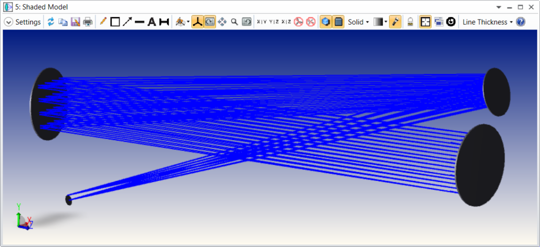 其中,系統(tǒng)的入射瞳孔直徑設(shè)置為原始Yolo的出射瞳孔直徑,近軸透鏡的焦距設(shè)置為與出射瞳孔位置相同的值。這為我們提供了一個(gè)與原始參考球體半徑相同的一階系統(tǒng)。