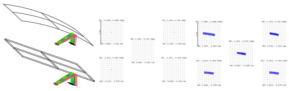 該系統(tǒng)可以簡(jiǎn)化為來(lái)自無(wú)窮遠(yuǎn)處(眼睛)的光,并被風(fēng)擋玻璃反射;反射后,點(diǎn)列圖可以告訴我們?cè)凇罢鎸?shí)”風(fēng)擋玻璃和理想風(fēng)擋玻璃(平面鏡)的情況下的光線角度。