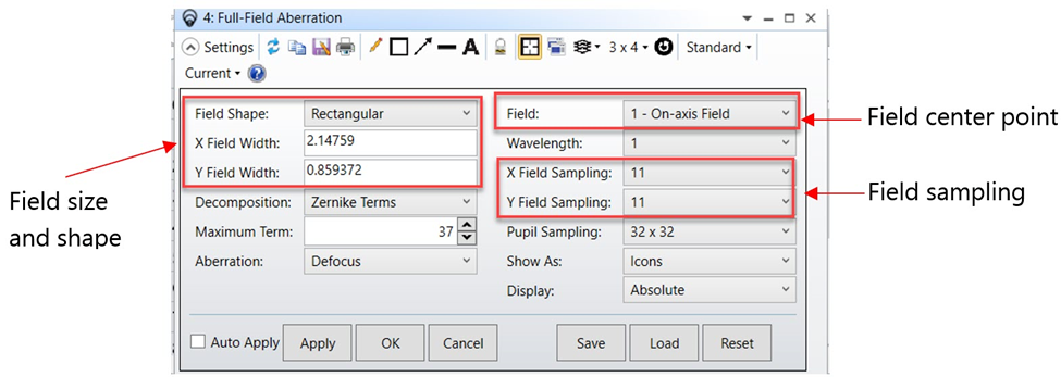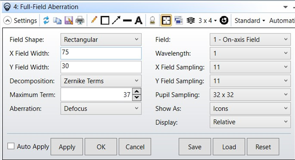 這里可以使用全視場(chǎng)像差來(lái)檢查視場(chǎng)采樣。視場(chǎng)上像差的快速變化可能意味著需要更多的視場(chǎng)點(diǎn)。