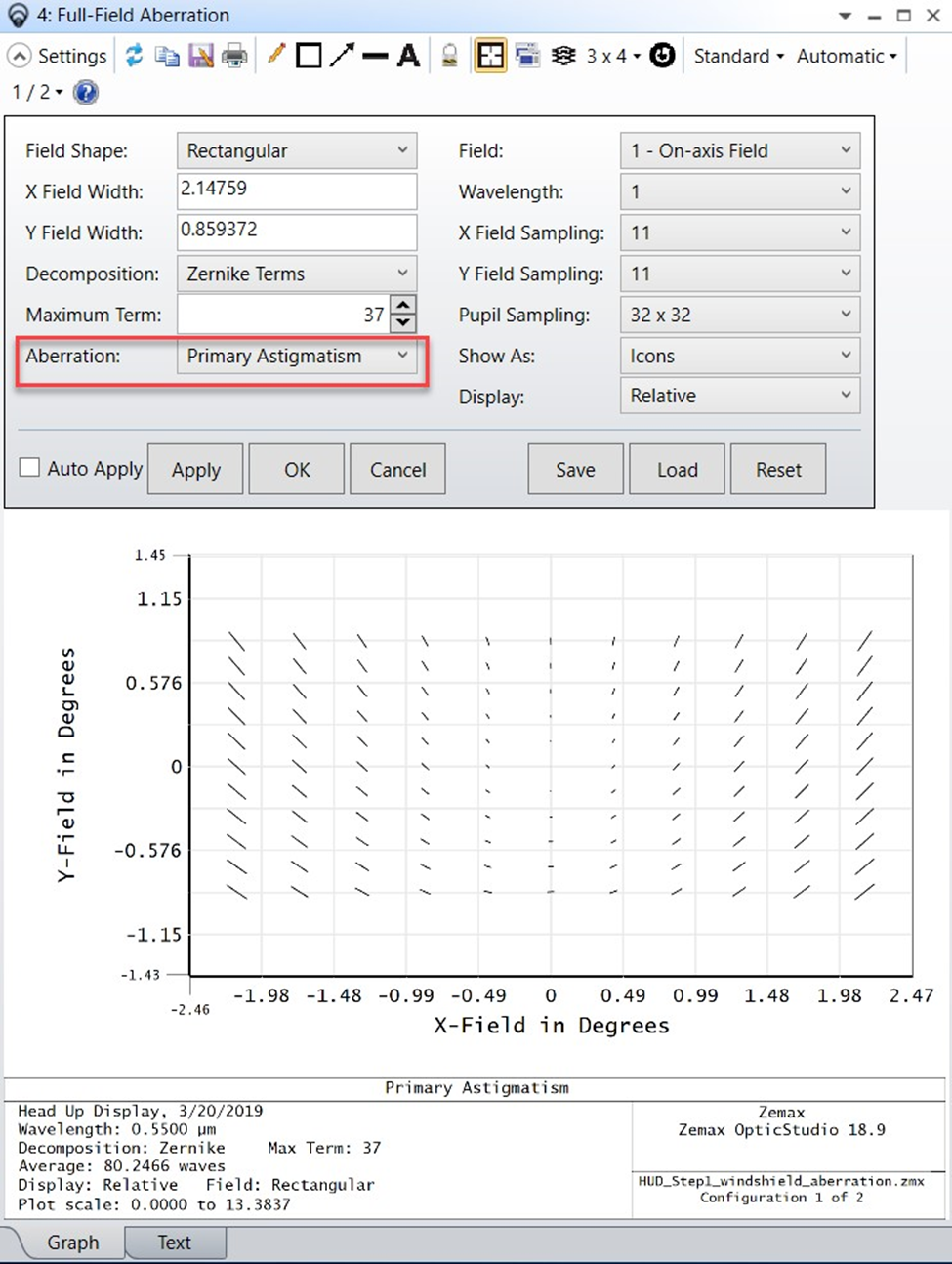 要分析風(fēng)擋玻璃引入的像差,請(qǐng)單擊 Analyze...Aberrations...Full Field Aberration。塞德?tīng)栂癫罟ぞ咴诖瞬贿m用,因?yàn)樗幻枋鲂D(zhuǎn)對(duì)稱系統(tǒng)中的三階像差。