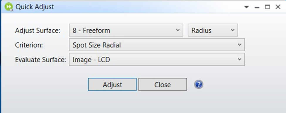 回到我們的原始文件“HUD_Step1_StartingPoint.zar”,自由曲面反射鏡現(xiàn)在可以進(jìn)行優(yōu)化,以校正風(fēng)擋玻璃引入的像差。首先,“優(yōu)化”下的“快速調(diào)整”工具可以用來(lái)使我們的自由曲面鏡成為球面鏡。這是一個(gè)很好的起點(diǎn)。