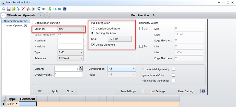 可以構(gòu)建默認(rèn)的評(píng)價(jià)函數(shù)來(lái)優(yōu)化最小的光斑尺寸(RMS點(diǎn))。該系統(tǒng)包含孔徑,因此將使用矩形陣列方式對(duì)光瞳進(jìn)行采樣。