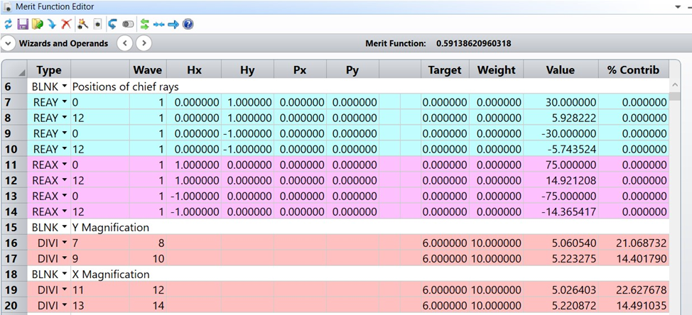 ·放大率:一個(gè)規(guī)格是關(guān)于放大率??梢蕴砑覴EA*(真實(shí)光線坐標(biāo))操作數(shù),以檢查L(zhǎng)CD顯示器上光線X和Y的位置。DIVI操作數(shù)可用于計(jì)算放大率(像面上的主光線高度與物面上的比率)。將在這些DIVI操作數(shù)上放置10的權(quán)重因子。