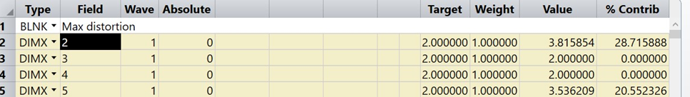 像畸變這樣的近軸計(jì)算并不總是能很好地處理具有坐標(biāo)間斷的非對(duì)稱系統(tǒng)。使用畸變操作數(shù)時(shí),請(qǐng)始終驗(yàn)證結(jié)果是否合理。可以使用CENX和CENY對(duì)視場(chǎng)的四個(gè)視場(chǎng)角(視場(chǎng)2至5)手動(dòng)檢查和/或計(jì)算質(zhì)心的位置。