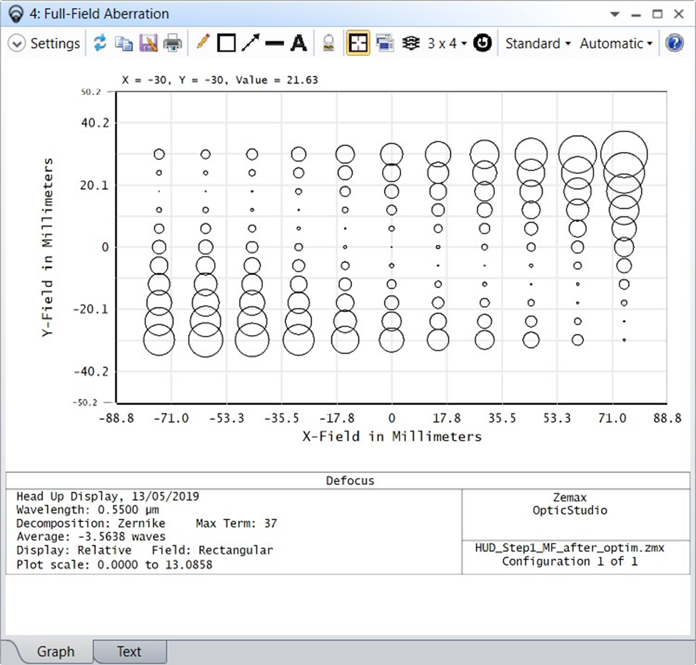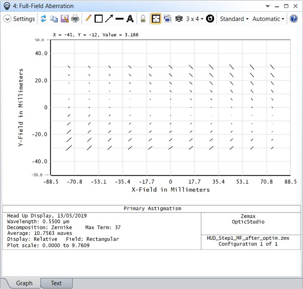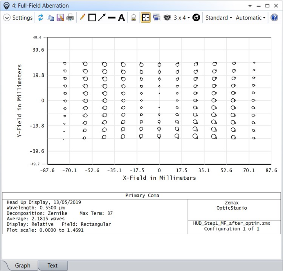 ·像散與彗差:可以再次檢查全視場(chǎng)像差,以查看優(yōu)化是否降低了初級(jí)像散。除了像散之外,最有可能影響HUD成像質(zhì)量的Zernike項(xiàng)是彗差和球差。用于以下結(jié)果的視場(chǎng)是總視場(chǎng),它表示駕駛員看到的最大角度范圍,允許頭部在HUD眼盒內(nèi)垂直和水平移動(dòng)。它還顯示了兩只眼睛所看到的視差。
