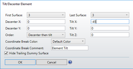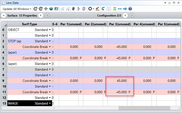 在鏡頭數(shù)據(jù)編輯器的上方工具欄中,點(diǎn)擊旋轉(zhuǎn)/偏心元件 (Tilt/Decenter Elements)工具,并將表面3旋轉(zhuǎn)-45度: