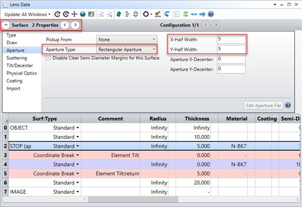 我們首先需要在表面8、10和12上設(shè)置矩形孔徑。對于表面8和12,設(shè)置表面屬性 (Surface Properties) 中的孔徑選項(xiàng)卡中的拾取自 (Pickup From)為表面2;對于表面10,設(shè)置拾取自為表面4。