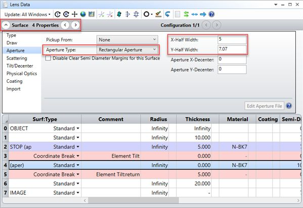 在表面4的表面屬性中的孔徑選項(xiàng)卡中進(jìn)行如下設(shè)置: