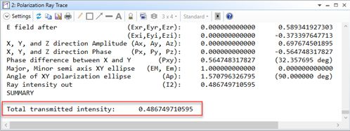 只有在分析或計(jì)算中考慮偏振影響時(shí),薄膜膜層的影響才會被考慮,在使用理想膜層時(shí)也是如此。像面上的總透射能量可以使用OpticStudio中的偏振分析功能進(jìn)行計(jì)算。我們將使用偏振光線追跡 (Polarization Ray Trace) 工具計(jì)算主光線在像面上的總透射能量。