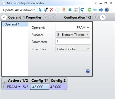 在多重結(jié)構(gòu)編輯器中插入多重結(jié)構(gòu)操作數(shù)PRAM,提取坐標(biāo)間斷面(表面5)的X旋轉(zhuǎn) (X Tilt) 參數(shù)(參數(shù)3)。