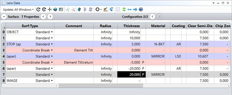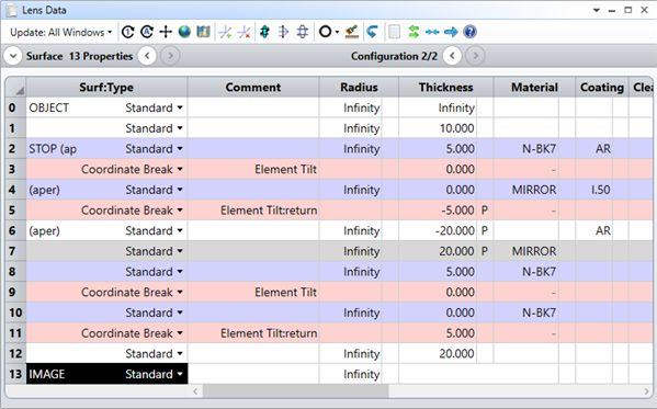 系統(tǒng)結(jié)構(gòu)現(xiàn)在看起來比較奇怪,這是由于表面的孔徑和表面傾斜導(dǎo)致的,我們將在下一節(jié)中進(jìn)行相應(yīng)的調(diào)整。
