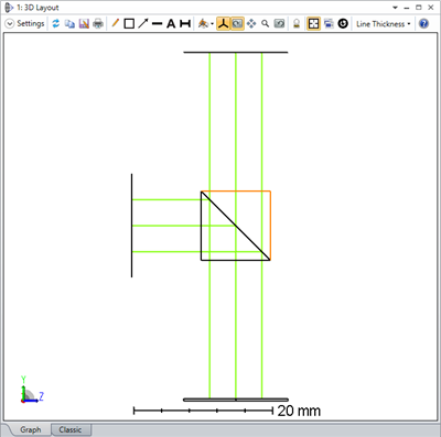 可以看到,反射光線(綠色表示)向錯(cuò)誤的方向傳播。這是由于結(jié)構(gòu)2中經(jīng)過鏡面后的表面的厚度的符號錯(cuò)誤導(dǎo)致的,因而造成了“虛擬的”光線傳播。對于正常的光線傳播來說,在鏡面后的厚度的符號會相應(yīng)的改變。在經(jīng)過偶數(shù)個(gè)鏡面后(包括0個(gè)鏡面),光線正常傳播的厚度的符號是正的,虛擬傳播的厚度的符號是負(fù)的。在經(jīng)過奇數(shù)個(gè)鏡面后,光線正常傳播的厚度的符號是負(fù)的,虛擬傳播的厚度的符號是正的。符號的規(guī)定與同一表面中的鏡面數(shù)量或坐標(biāo)間斷面無關(guān)。使用坐標(biāo)間斷面旋轉(zhuǎn)180°不會改變這一基本符號規(guī)定。因此,我們需要將結(jié)構(gòu)2中的表面5和6的厚度改變?yōu)?20mm。