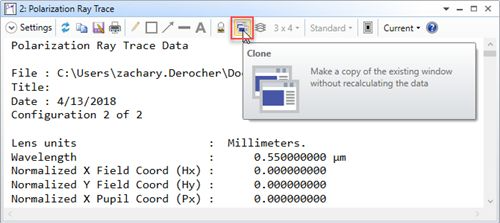 在偏振光線追跡窗口中的工具欄中點(diǎn)擊復(fù)制 (Clone)打開另一個(gè)參數(shù)設(shè)置相同的偏振光線追跡分析窗口。