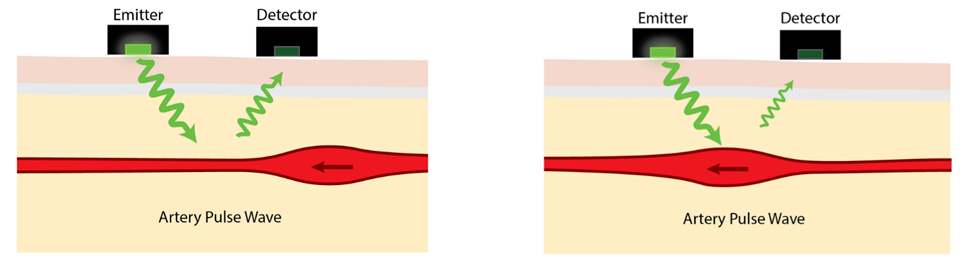PPG 傳感器可設(shè)計為反射或透射模式。由于光的穿透深度取決于其波長,因此綠色和黃色 LED 光線最適合在淺表血流中進行測量,并且通常以反射模式使用。另一方面,紅外和近紅外波長更適合測量深層組織血流,可用于透射模式。在次案例中,我們展示了一個反射 PPG 設(shè)備。