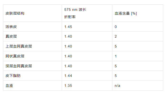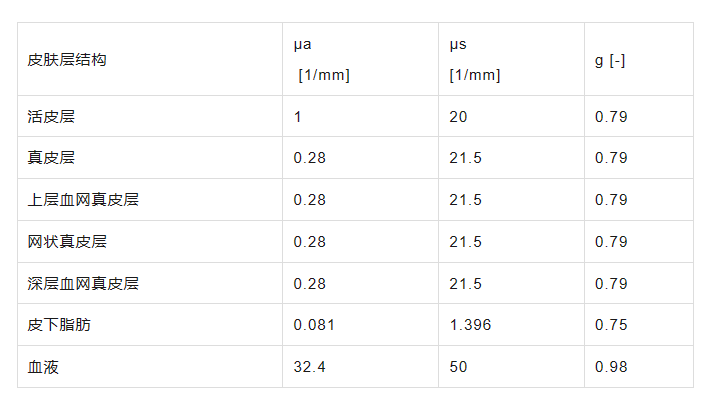 類似地,與之前的折射率、散射和吸收系數(shù)以及不同皮膚層的各向異性因子一樣,為血液和組織其余部分相應(yīng)值的加權(quán)平均值進行計算,以下為對應(yīng)于 575 nm 應(yīng)用波長的原始數(shù)據(jù):