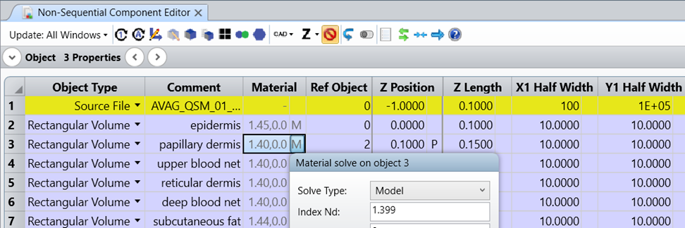 上述所有皮膚層在 OpticStudio 中都建模為矩形物體,每層的厚度值基于文獻數(shù)據(jù),通過使得側(cè)面沒有漏光的方式來確定橫截面的尺寸。通過使用上一個層作為參考對象并對上一個層的 Z 長度單元格中的 Z 位置值應(yīng)用 Pickup 求解來放置后續(xù)層結(jié)構(gòu)。該解決方案確保了各層結(jié)構(gòu)緊貼在一起,之間沒有任何間隙。