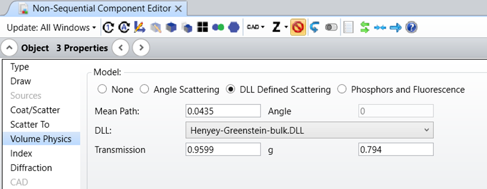 在 OpticStudio 的非序列模式下,Henyey-Greenstein 體散射模型以 DLL (Henyey-Greenstein-bulk.DLL) 的形式提供,包含在 OpticStudio 安裝文件中。