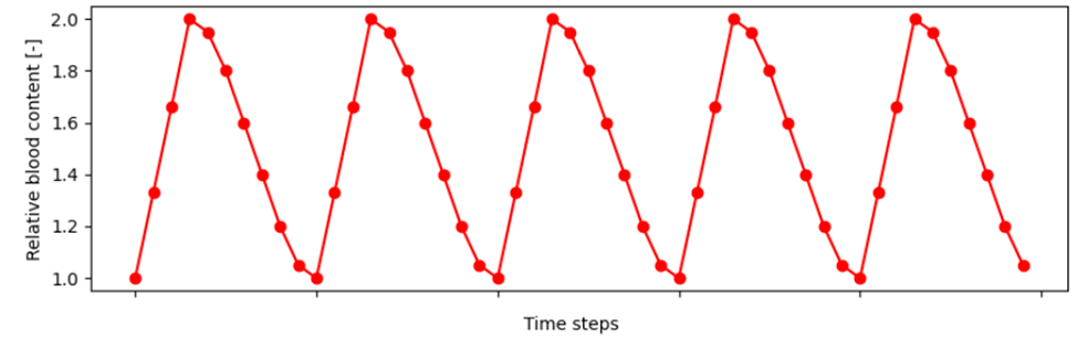 根據(jù)文獻,當(dāng)心臟在收縮期將血液泵入血管時,皮膚層的相對血液含量會翻倍。我們使用經(jīng)驗函數(shù)來表征這種脈動,下圖顯示了 5 個心臟周期的結(jié)果(10步長/周期)。