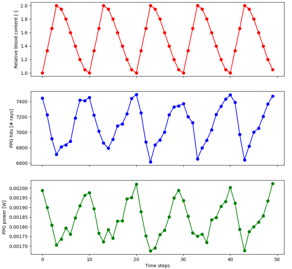 由于血液的吸收和散射系數(shù)比組織的其余部分大得多,因此血液含量越高,背散射光能量越低,檢測器的測量功率也越低,反之亦然。根據(jù)我們的模擬,在每個時間步長使用 1W 的光源和 105 條分析光線,建模的血含量脈動導(dǎo)致檢測器信號發(fā)生 10~15% 的變化,如下圖所示。