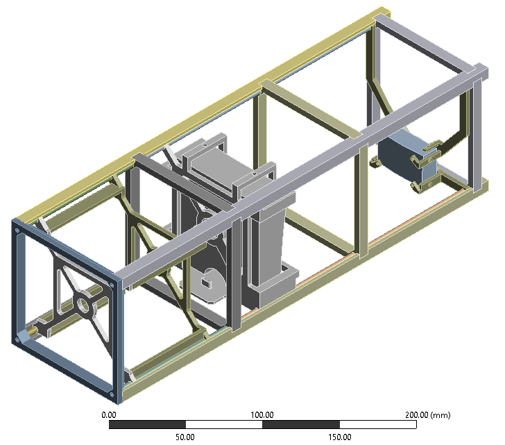 在 OpticsBuilder 中完成光機(jī)械結(jié)構(gòu)設(shè)計(jì)后,現(xiàn)在可以將完整的立方體衛(wèi)星模型導(dǎo)入 Ansys 軟件,為有限元分析做準(zhǔn)備。首先,將幾何結(jié)構(gòu)以 STEP 文件格式從 Creo 導(dǎo)出到 3D 建模軟件 Ansys SpaceClaim。在 SpaceClaim 中,為了降低復(fù)雜性,簡(jiǎn)化了模型的幾何形狀。