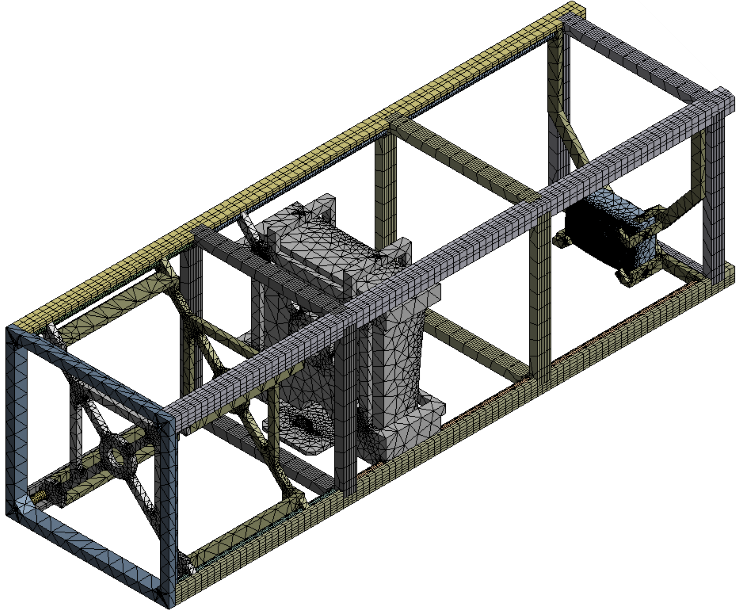 對(duì)于結(jié)構(gòu)分析,只需使用組件的核心部分。為了簡(jiǎn)化分析模型,移除了立方體衛(wèi)星的側(cè)板和彈簧螺栓等小部件。結(jié)果如下圖所示: