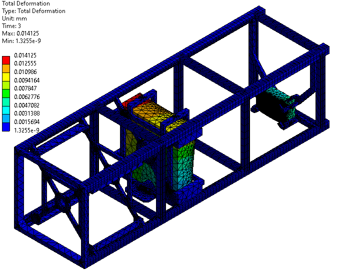 完成準(zhǔn)備工作后,現(xiàn)在可以在 Ansys Mechanical 中運(yùn)行 FEA 分析。下圖顯示了最低工作溫度 12°C 的結(jié)果,主要的形變是由鋁基板的高 CTE 導(dǎo)致反射鏡收縮引起的。