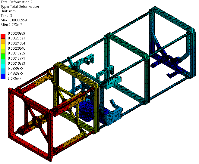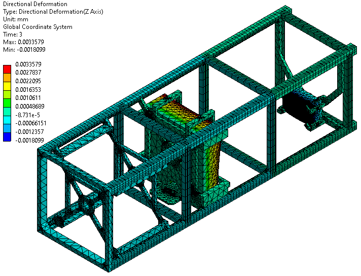 對(duì)重力影響的分析結(jié)果顯示,如果組件僅由框架的一側(cè)支撐,那么反射鏡的固定裝置就會(huì)產(chǎn)生較大的變形,導(dǎo)致反射鏡相對(duì)于其原始位置移動(dòng)了 8 微米以上。因此,在分析中在反射鏡固定裝置的底部增加一個(gè)額外的支撐幫助承擔(dān)反射鏡的重量。通過(guò)這種設(shè)定,反射鏡的形變小于 20 納米。