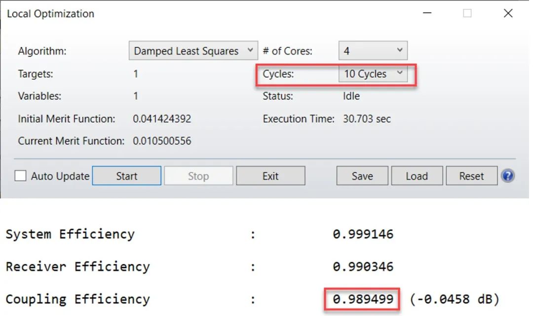 經(jīng)過 10 次優(yōu)化循環(huán),光纖/透鏡厚度變?yōu)?0.107 mm(簡單高斯計算后為 0.117 mm),光纖耦合結果如下。