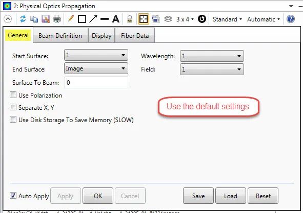 要設置 POP 計算,請轉(zhuǎn)到分析功能區(qū)...物理光學,并使用以下設置。