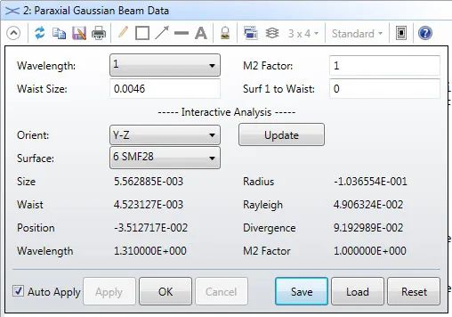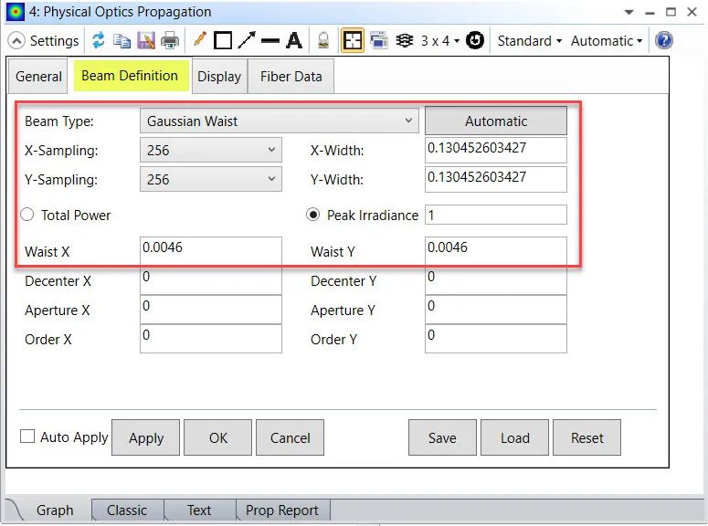 在“光束定義”選項卡中,首先輸入“X采樣”和“Y采樣”和“束腰X和束腰Y”。然后,單擊“自動”按鈕以計算數(shù)據(jù)點之間的初始寬度。