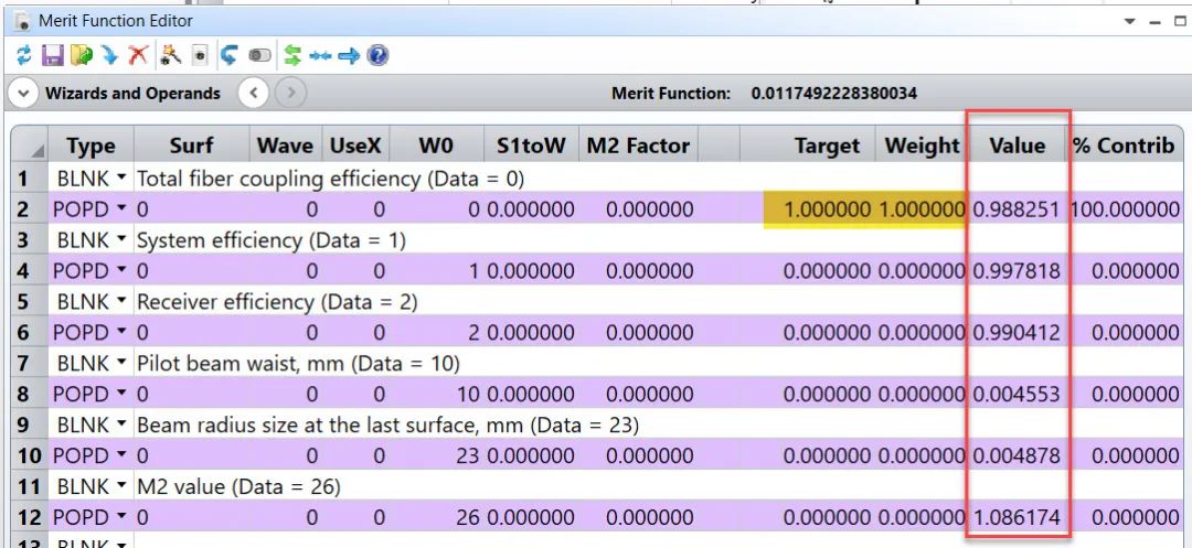 POPD操作數(shù)可用于評價函數(shù),以計算總光纖耦合效率、系統(tǒng)效率、接收器效率、理想波束腰尺寸、實際波束尺寸、得到的M2值,以及更多的診斷數(shù)量。以下是評價函數(shù)編輯器中這些 POPD 結果的屏幕截圖。