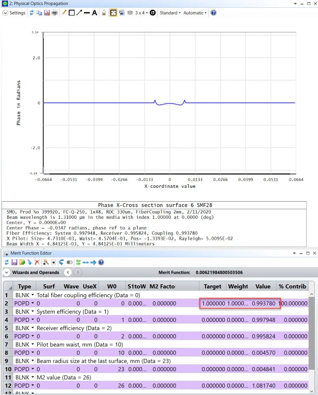 此時的文件保存為“after POP.zmx”。光纖耦合略有改善,但大部分相位誤差發(fā)生在能量很少的地方。