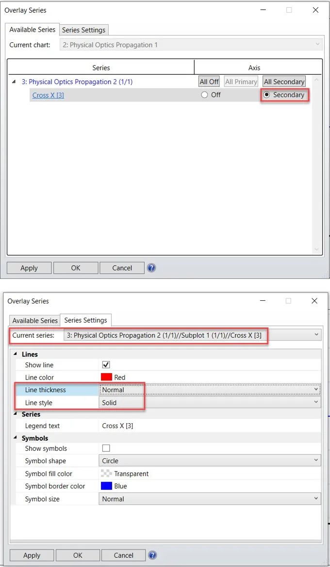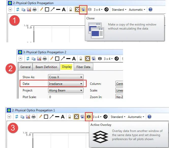 要創(chuàng)建如上所示的疊加圖,請轉(zhuǎn)到物理光學傳播分析的工具欄,然后單擊克隆按鈕以創(chuàng)建窗口的第二個副本。在第二個窗口中,展開設置,然后轉(zhuǎn)到“顯示”選項卡。將“數(shù)據(jù)”設置更改為“輻照度”。然后,返回到第一個窗口,然后單擊分析工具欄中的“活動疊加”按鈕。這些步驟如下面的屏幕截圖所示。