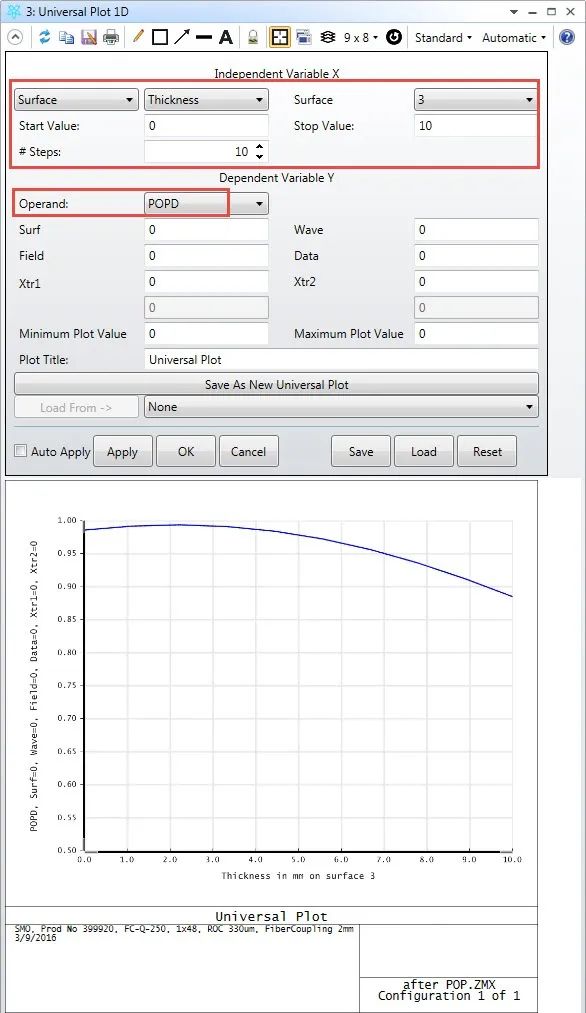 “物理光學傳播”窗口顯示光纖耦合結果;請參閱以下屏幕截圖中繪圖下方突出顯示的文本。POPD 優(yōu)化操作數(shù)通過評價函數(shù)編輯器報告所有物理光學數(shù)據(jù),通常是更有用的參考。有關詳細信息,請參閱幫助文件中 POPD 操作數(shù)的說明。POPD 操作數(shù)使用 POP 分析窗口的已保存設置,因此,如果您尚未保存這些設置,請立即保存?!氨4妗卑粹o在下面的屏幕截圖中以紅色框框顯示。