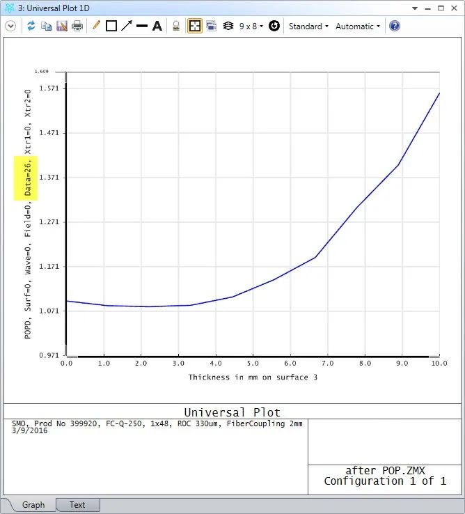 將總光纖耦合效率操作數(shù)的目標和權重設置為 1(POPD 數(shù)據(jù) = 0)。如果我們進行優(yōu)化(請記住,光纖/透鏡間距是唯一的變量),我們會得到一個小的改進。