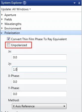 重新打開“after POP.zmx”示例文件,在光纖耦合分析和物理光學傳播的設置中...常規(guī),檢查使用極化。保存設置。然后轉(zhuǎn)到系統(tǒng)資源管理器...極化,并將入射極化定義為在 Y 方向上呈線性。