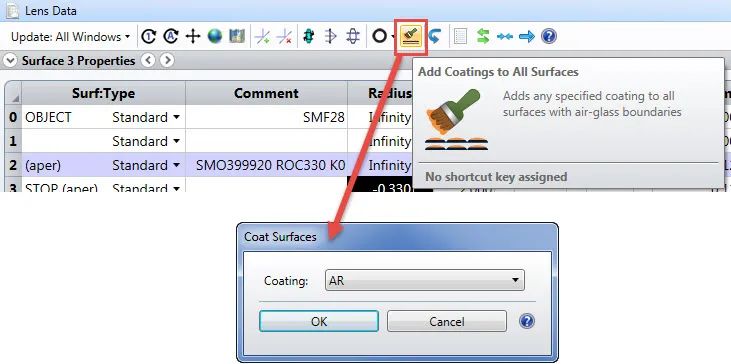 在鏡頭數(shù)據(jù)編輯器的工具欄中,單擊“將鍍膜添加到所有曲面”按鈕,然后將 AR 鍍膜(單層 MgF2)添加到所有玻璃曲面。